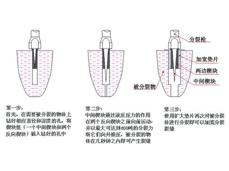 其具體實(shí)施步驟如下:首先,在被分裂的物體上鉆一個(gè)特定直徑和深度的孔,將分裂機(jī)的楔塊組(一個(gè)中間楔塊和兩個(gè)反向楔塊)插入孔中,中間楔塊通過液壓壓力的作用在兩個(gè)反向楔塊之間向前運(yùn)動(dòng),由內(nèi)向外釋放出很大的能量,將被分裂的物體在幾秒鐘之內(nèi)按預(yù)定方向裂開。